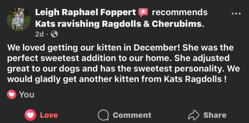 Read testimonials from satisfied clients who have welcomed a KATS Ravishing Ragdoll kittens & have used our stud services. We pride ourselves on healthy, happy cats and excellent customer service. Your satisfaction is our top priority.